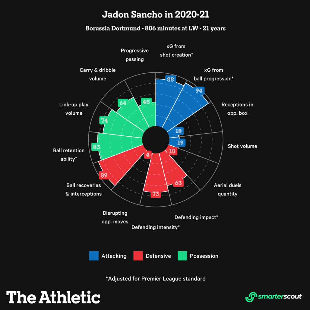 На левом фланге ему помогал техничный созидатель Рафаэл Геррейру. На правом – Тома Менье, больше сосредоточенный на своей штрафной площади. Тем не менее, вклад Санчо в игру команды остался существенным. К такому выводу можно прийти, используя smarterscout. Это программа обрабатывает продвинутую статистику и дает игрокам рейтинг от 0 до 99 в зависимости от того, как часто и насколько эффективно игрок использует то или иное действие.