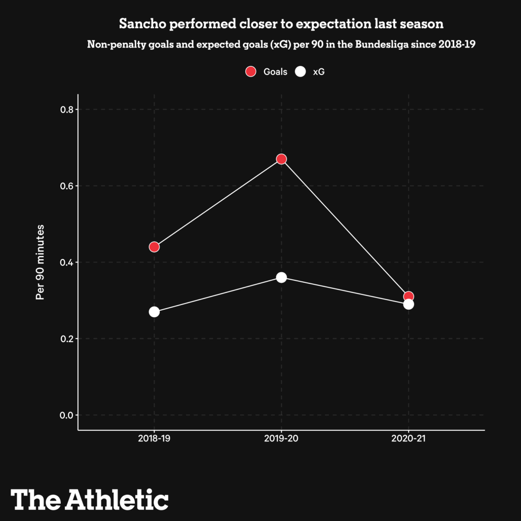 В позапрошлом сезоне, когда он побил всевозможные рекорды для игроков до 21 года, был явный оверперфоманс. Джейдон превзошел свой показатель xG на 60%, забив 17 при ожидаемых 9,3. Это говорило о том, что его ждал регресс к среднему. Так и случилось в сезоне 2020/21.