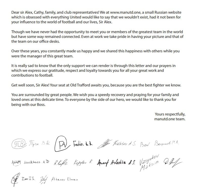 К пожеланиям скорейшего выздоровления присоединилась и команда manutd.one. Вот такое письмо было отправлено в клуб.