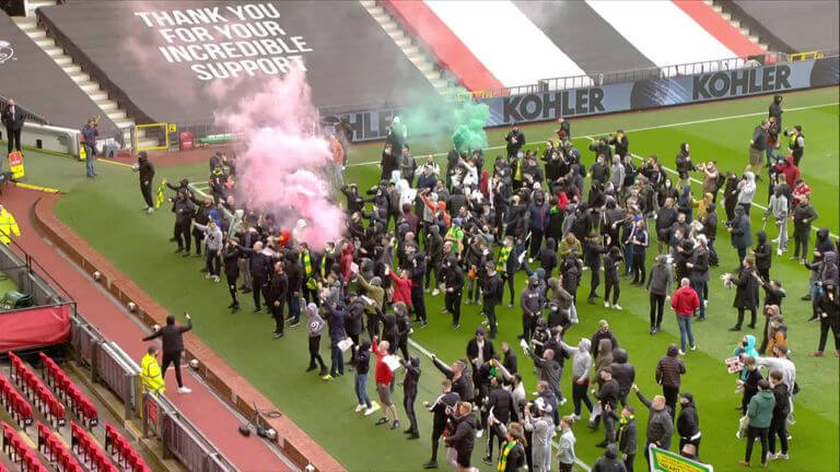 «Протестующие за пределами «Олд Траффорд» стали вести себя особенно агрессивно по отношению к полиции, и группа примерно из 100 человек проникла на стадион, при этом некоторым сотрудникам «Юнайтед» пришлось запираться в комнатах».