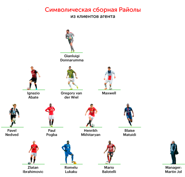 Но на самом деле это парень – один из самых влиятельных агентов футбольного мира. Это не совпадение, что этим летом сразу три клиента Райолы перешли в «Манчестер Юнайтед»: Поль Погба, Златан Ибрагимович и Генрих Мхитарян. Под крылом Райолы также приютился и итальянский футболист Марио Балотелли, вечный нераскрытый талант. Любите ли вы Райолу или ненавидите (сэр Алекс, например, ненавидит), он приложил свою руку к формированию современного трансферного рынка.